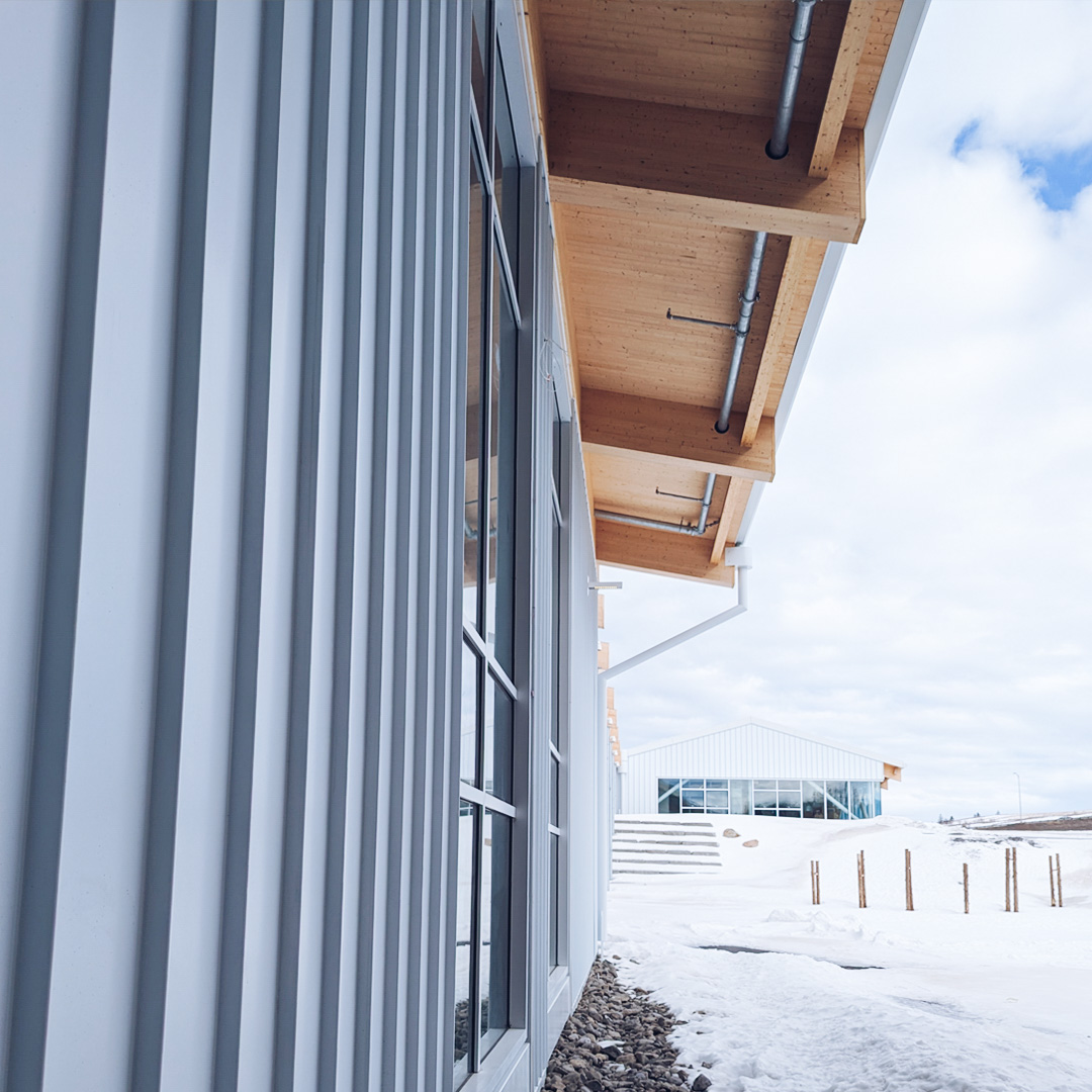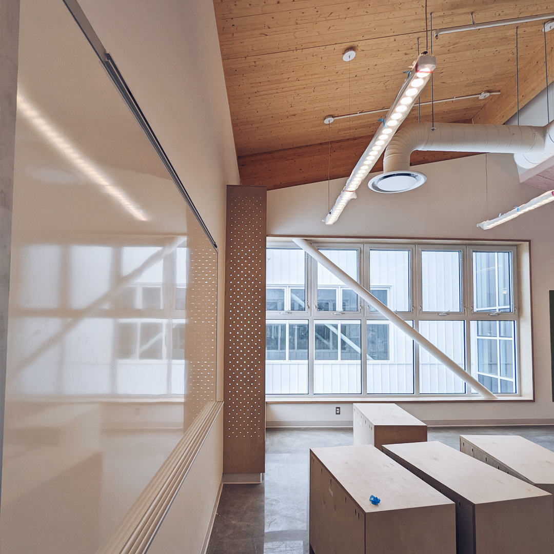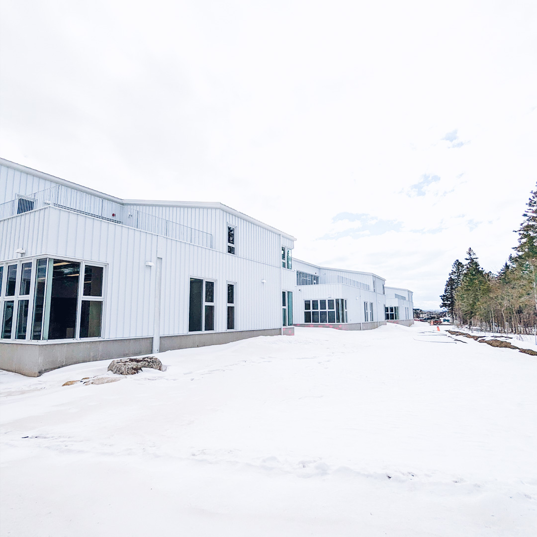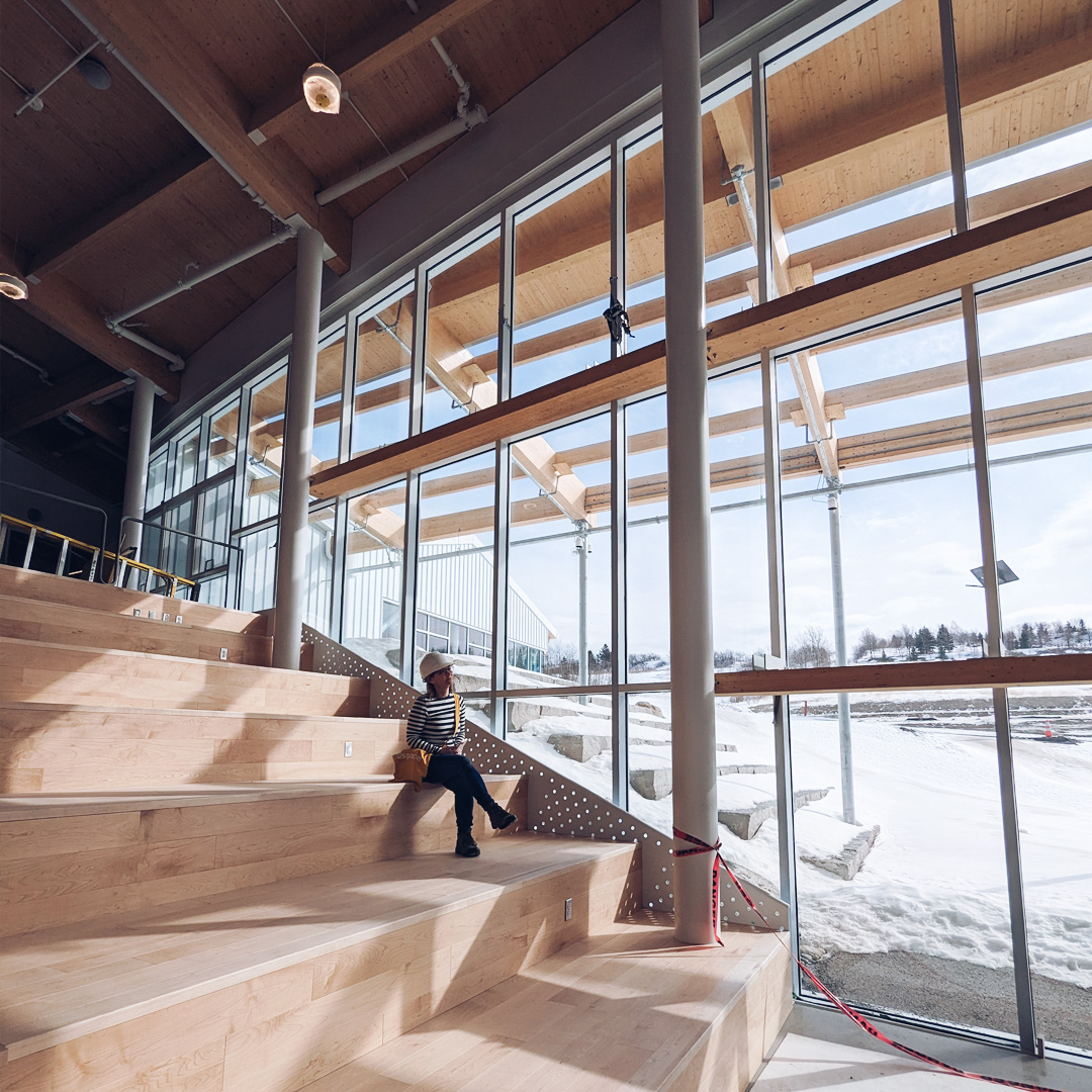La toiture articulée en bois apparent se déploie pour laisser entrer la lumière partout. Aussi peu de murs et autant de fenêtres que possible intègrent l’école à la nature environnante. Forêt au nord, et champ au sud, l’école est un écotone entre les deux. Le parvis et les préaux sont appropriables par la communauté, tel que la plupart de l’école elle-même. Notre école buissonnière épouse la topographie naturelle du terrain pour offrir un accès de plain-pied à ses deux niveaux.