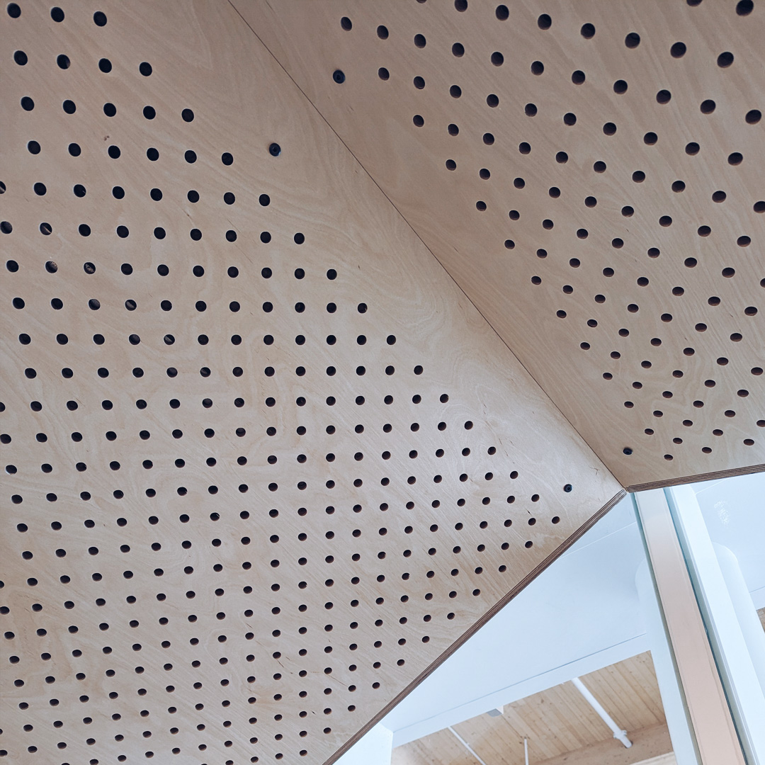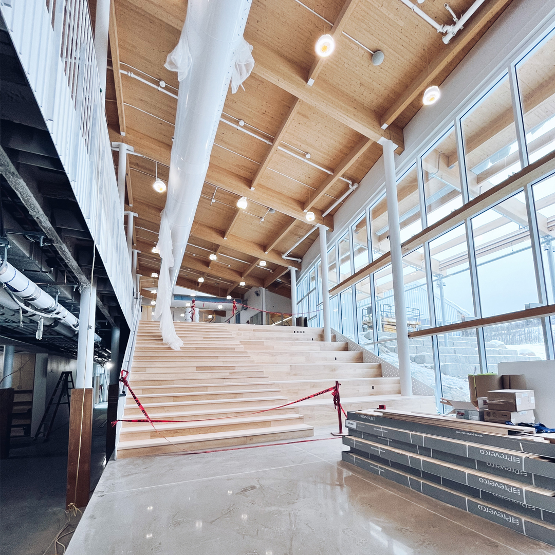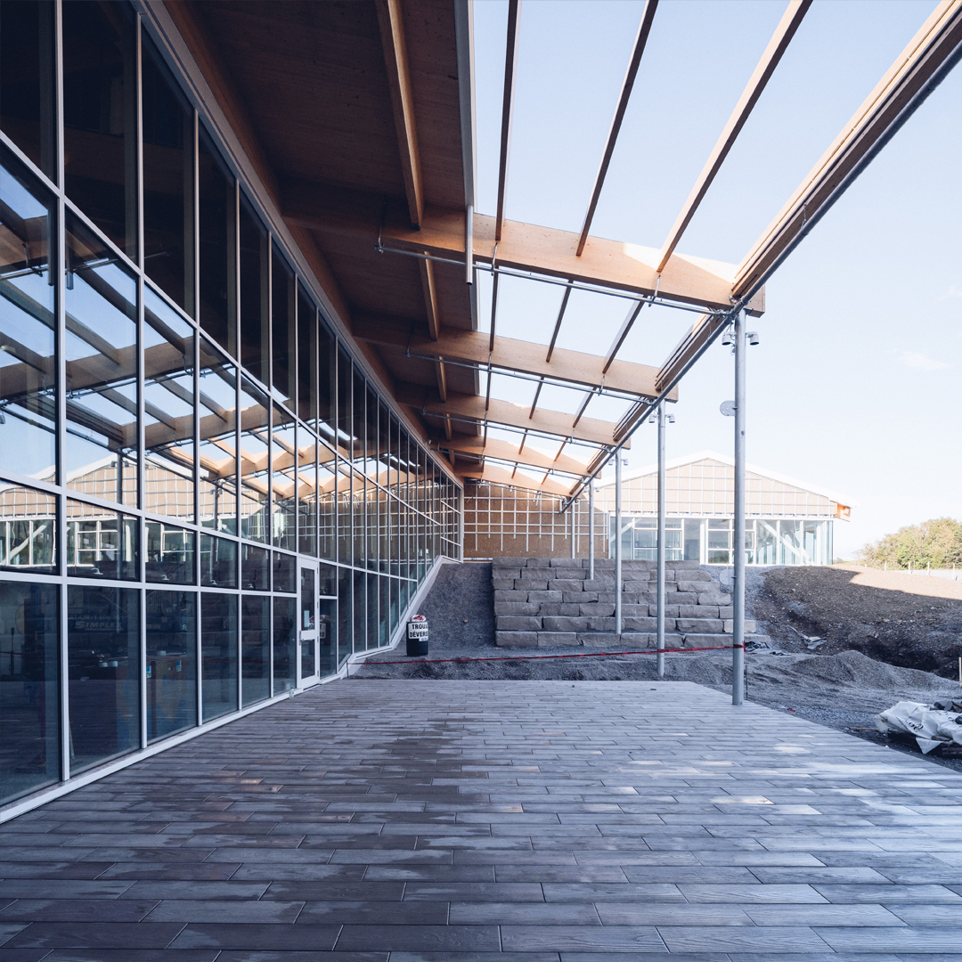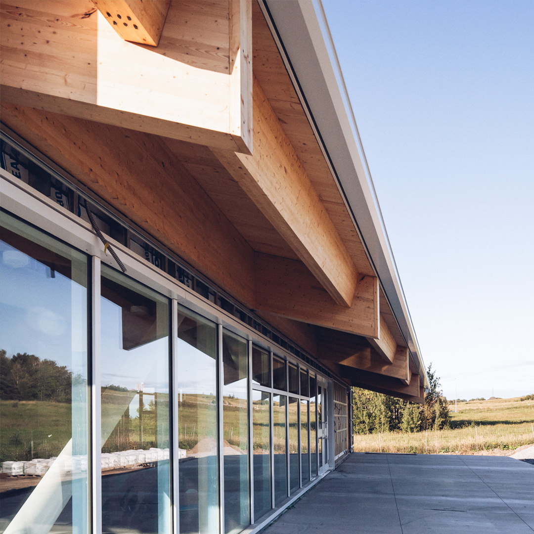 La toiture articulée en bois apparent se déploie pour laisser entrer la lumière partout. Aussi peu de murs et autant de fenêtres que possible intègrent l’école à la nature environnante. Forêt au nord, et champ au sud, l’école est un écotone entre les deux. Le parvis et les préaux sont appropriables par la communauté, tel que la plupart de l’école elle-même. Notre école buissonnière épouse la topographie naturelle du terrain pour offrir un accès de plain-pied à ses deux niveaux.